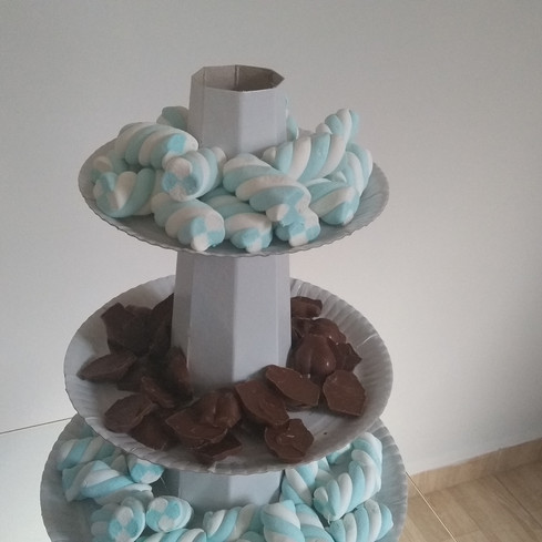 Infelizmente, não tenho fotos do que servi no meu chá. Mas minha ideia foi fazer algo bem parecido com um brunch. Então teve: pão com patê, bolo de chocolate, bolo de churros, refrigerante, suco e chocolates.